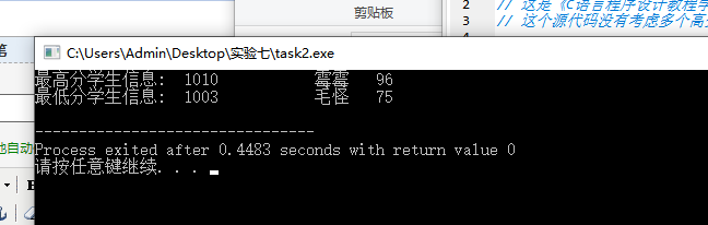 // 从文本文件file1.dat中读取数据,找出最高分和最低分学生信息,并输出在屏幕上 // 这是《C语言程序设计教程学习指导》「2.10 文件」中的实验,细微处做了微调 // 这个源代码没有考虑多个高分或多个低分的情形。 #include <stdio.h> #include <stdlib.h> #define N 10 // 定义一个结构体类型STU typedef struct student { int num; char name[20]; int score; }STU; int main() { STU st, stmax, stmin; int i; FILE *fp; // 以只读文本方式打开文件file1.dat fp = fopen("file1.dat", "r"); if( !fp ) { // 如果打开失败,则输出错误提示信息,然后退出程序 printf("fail to open file1.dat\n"); exit(0); } stmax.score = 0; // 先假定最高分是0,后面如发现比当前最高分还高的分数,就更新最高分 stmin.score = 100; // 先假定最低分是100分,后面如发现比当前最低分更低的分数,就更新最低分 for(i=0; i<N; i++) { fscanf(fp, "%d %s %d", &st.num, st.name, &st.score); // 从fp指定的文件中格式化读取一个学生信息 if(st.score > stmax.score) stmax = st; else if(st.score < stmin.score) stmin = st; } fclose(fp); printf("最高分学生信息: %5d%15s%5d\n", stmax.num, stmax.name, stmax.score); printf("最低分学生信息: %5d%15s%5d\n", stmin.num, stmin.name, stmin.score); return 0; }