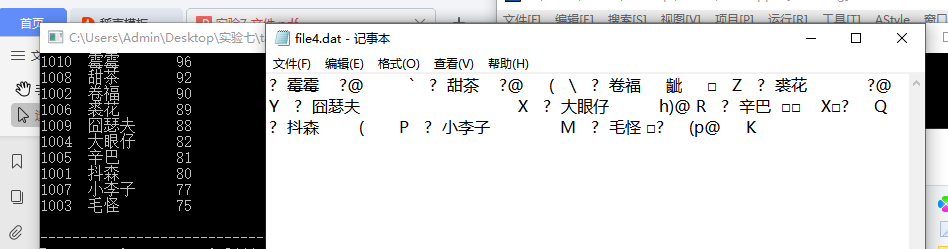 #include <stdio.h> #include <stdlib.h> #define N 10 typedef struct student { int num; char name[20]; int score; }STU; int main(){ FILE *fin,*fout; STU st[N]; int i; fin=fopen("file4.dat","rb"); if(!fin){ printf("Failed to open the file\n"); exit(0); } for(i=0; i<N; i++) printf("%-6d%-10s%3d\n", st[i].num, st[i].name, st[i].score); fread(st,sizeof(STU),N,fin); fclose(fin); for(i=0; i<N; i++) fprintf(stdout,"%-6d%-10s%3d\n", st[i].num, st[i].name, st[i].score); fclose(fout); return 0; }
