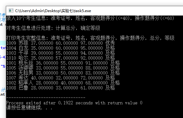 #include <stdio.h> #include <string.h> const int N = 10; // 定义结构体类型struct student,并定义其别名为STU typedef struct student { long int id; char name[20]; float objective; /*客观题得分*/ float subjective; /*操作题得分*/ float sum; char level[10]; }STU; // 函数声明 void input(STU s[], int n); void output(STU s[], int n); void process(STU s[], int n); int main() { STU stu[N]; printf("录入%d个考生信息: 准考证号,姓名,客观题得分(<=40),操作题得分(<=60)\n", N); input(stu, N); printf("\n对考生信息进行处理: 计算总分,确定等级\n"); process(stu, N); printf("\n打印考生完整信息: 准考证号,姓名,客观题得分,操作题得分,总分,等级\n"); output(stu, N); return 0; } // 从文本文件examinee.txt读入考生信息:准考证号,姓名,客观题得分,操作题得分 void input(STU s[], int n) { // 补足代码 // ××× FILE *fin; int i; fin=fopen("examinee.txt","r"); if(!fin){ printf("failed to open!\n"); return; } for(i=0;i<n;i++){ fscanf(fin,"%d %s %f %f",&s[i].id,s[i].name,&s[i].objective,&s[i].subjective); } fclose(fin); } // 输出考生完整信息: 准考证号,姓名,客观题得分,操作题得分,总分,等级 // 不仅输出到屏幕上,还写到文本文件result.txt中 void output(STU s[], int n) { // 补足代码 // ××× FILE *fout; int i; fout=fopen("result.txt","w+"); for(i=0;i<n;i++) fprintf(fout,"%-4ld %s %-4f %-4f %f %s\n",s[i].id,s[i].name,s[i].objective,s[i].subjective,s[i].sum,s[i].level); for(i=0;i<n;i++) fprintf(stdout,"%-4ld %s %-4f %-4f %f %s\n",s[i].id,s[i].name,s[i].objective,s[i].subjective,s[i].sum,s[i].level); fclose(fout); } // 对考生信息进行处理:计算总分,排序,确定等级 void process(STU s[], int n) { // 补足代码 // ××× int i,t; int k=0; STU temp; for(i=0;i<n;i++){ s[i].sum=s[i].objective + s[i].subjective; if(s[i].sum<60) strcpy(s[i].level,"不及格"); else if(s[i].sum>95) strcpy(s[i].level,"优秀"); else strcpy(s[i].level,"及格"); } for(i=0;i<n;i++){ for(t=i+1;t<n;t++){ if(s[t].sum>s[i].sum){ temp=s[i]; s[i]=s[t]; s[t]=temp; } } } }