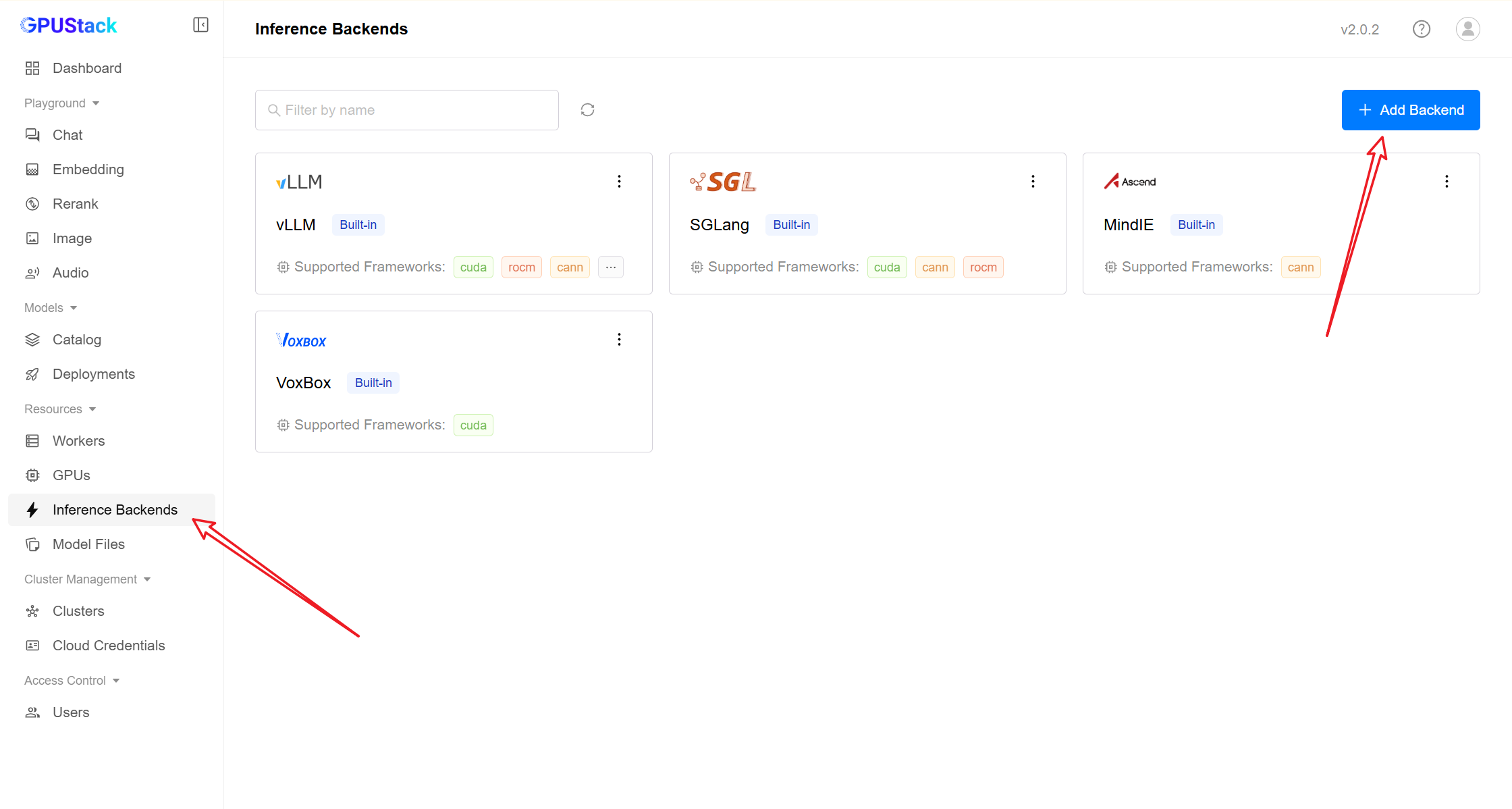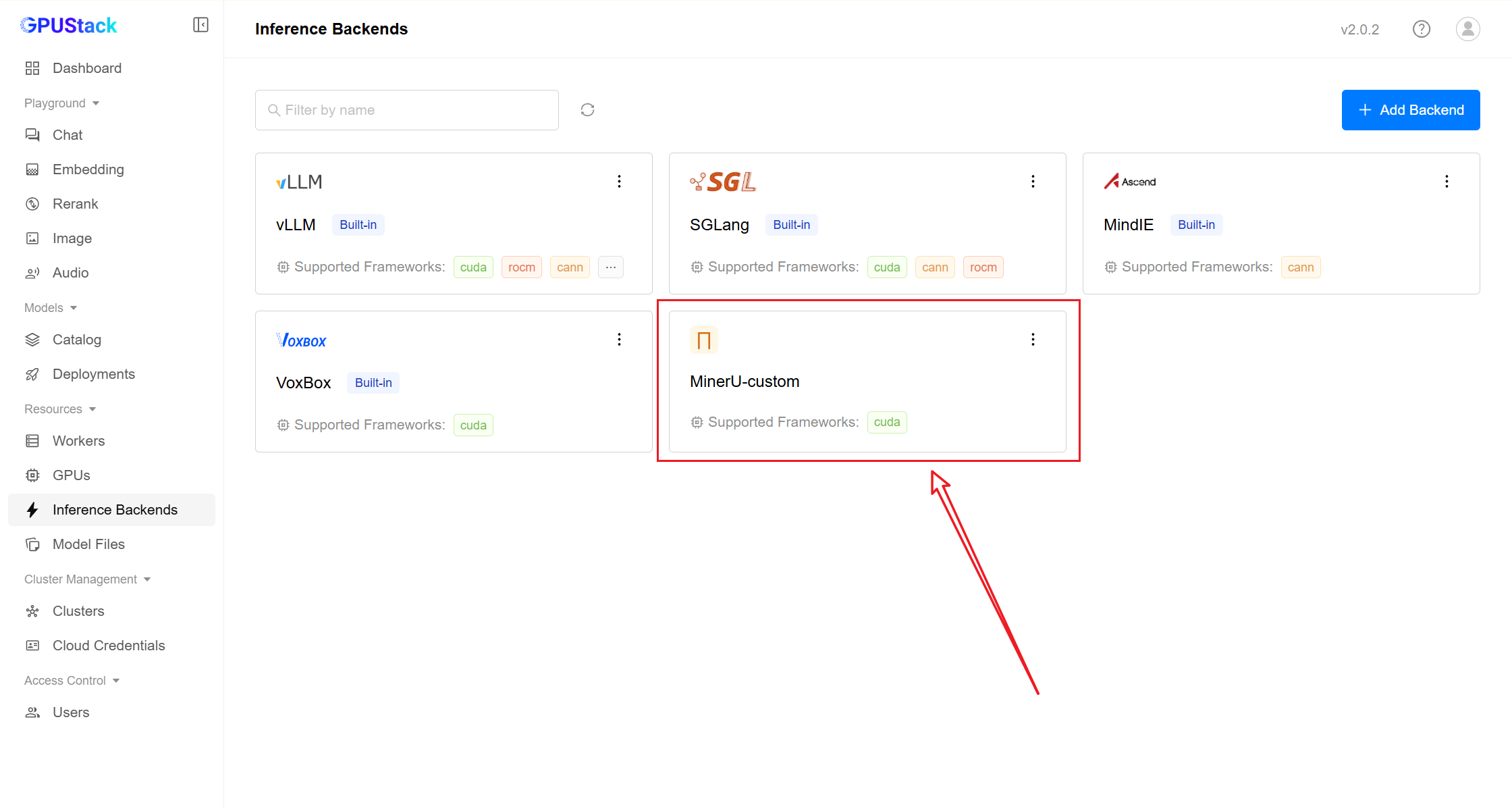 镜像准备好后,我们需要在 GPUStack 中将其注册为一个新的后端。