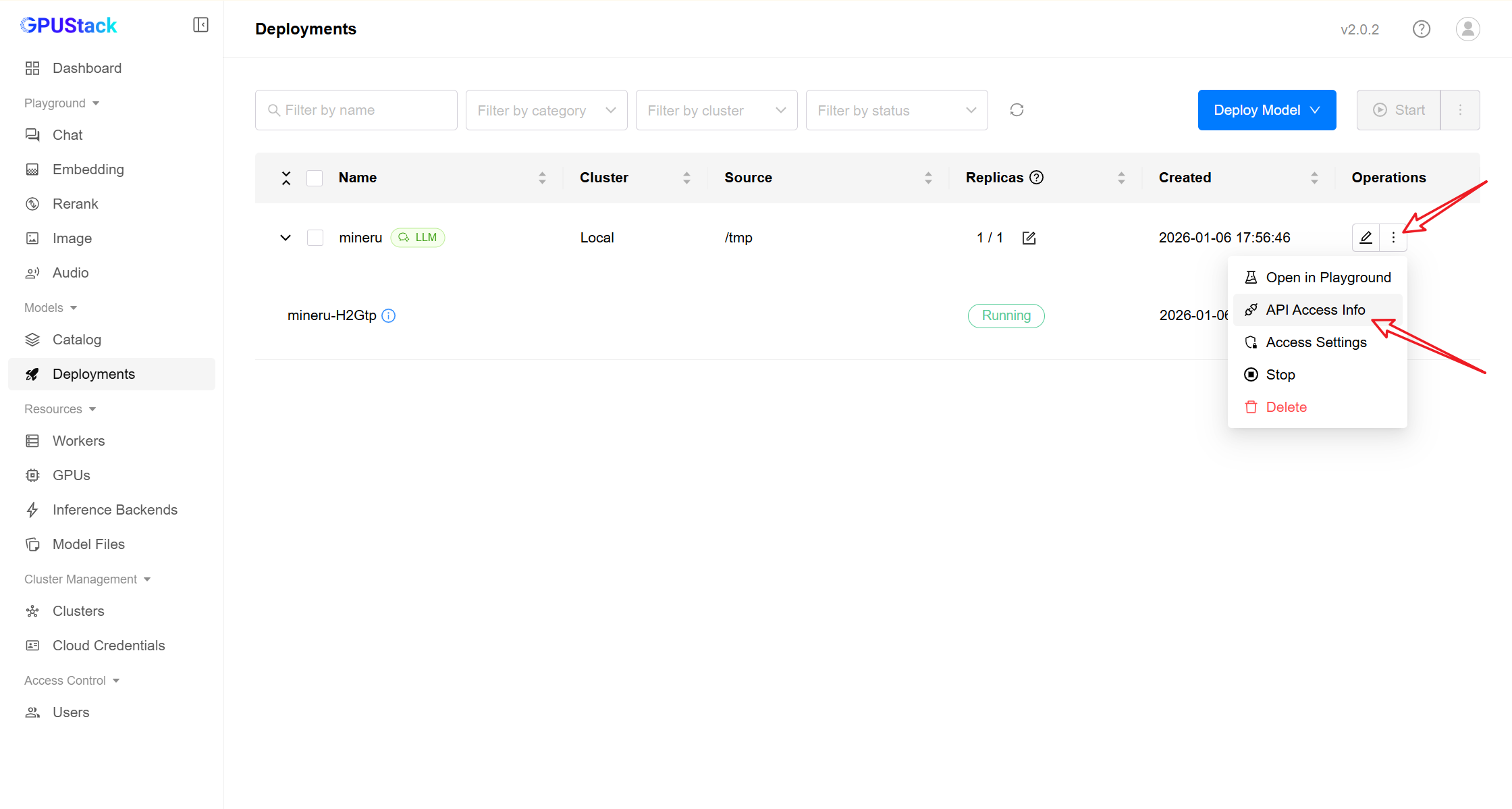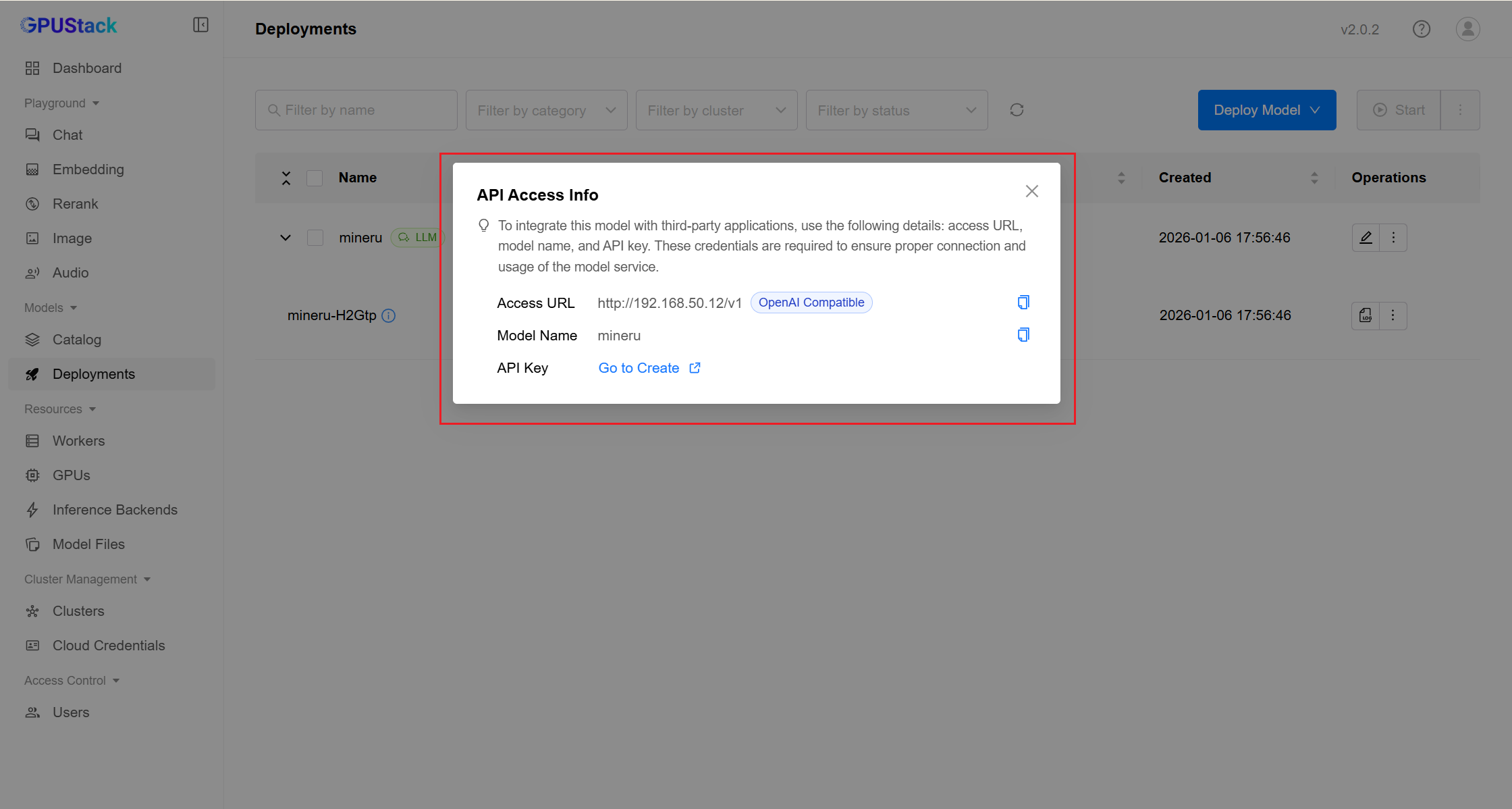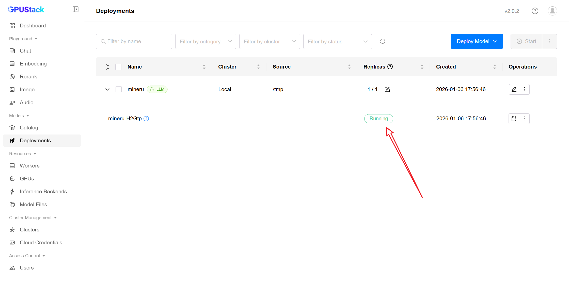 后端注册完成后,就可以像部署普通 LLM 一样部署 MinerU 了。