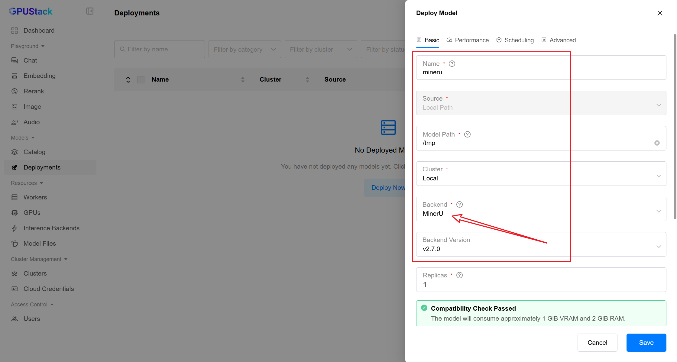 - 在部署配置中,选择我们刚刚注册的 MinerU 后端。