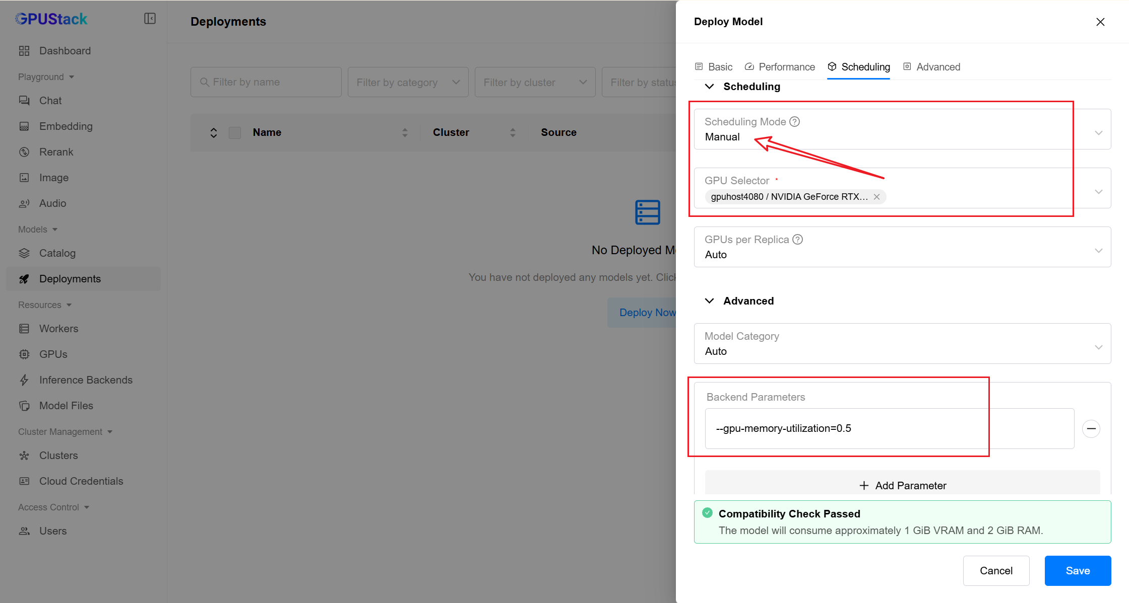 由于镜像内已预置模型权重,此处的 /tmp 仅作为路径占位。这可能导致系统对显存资源的估算出现偏差,因此建议选择 手动调度 (Manual Scheduling) 模式。