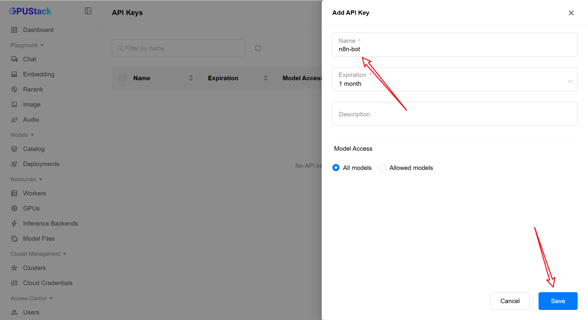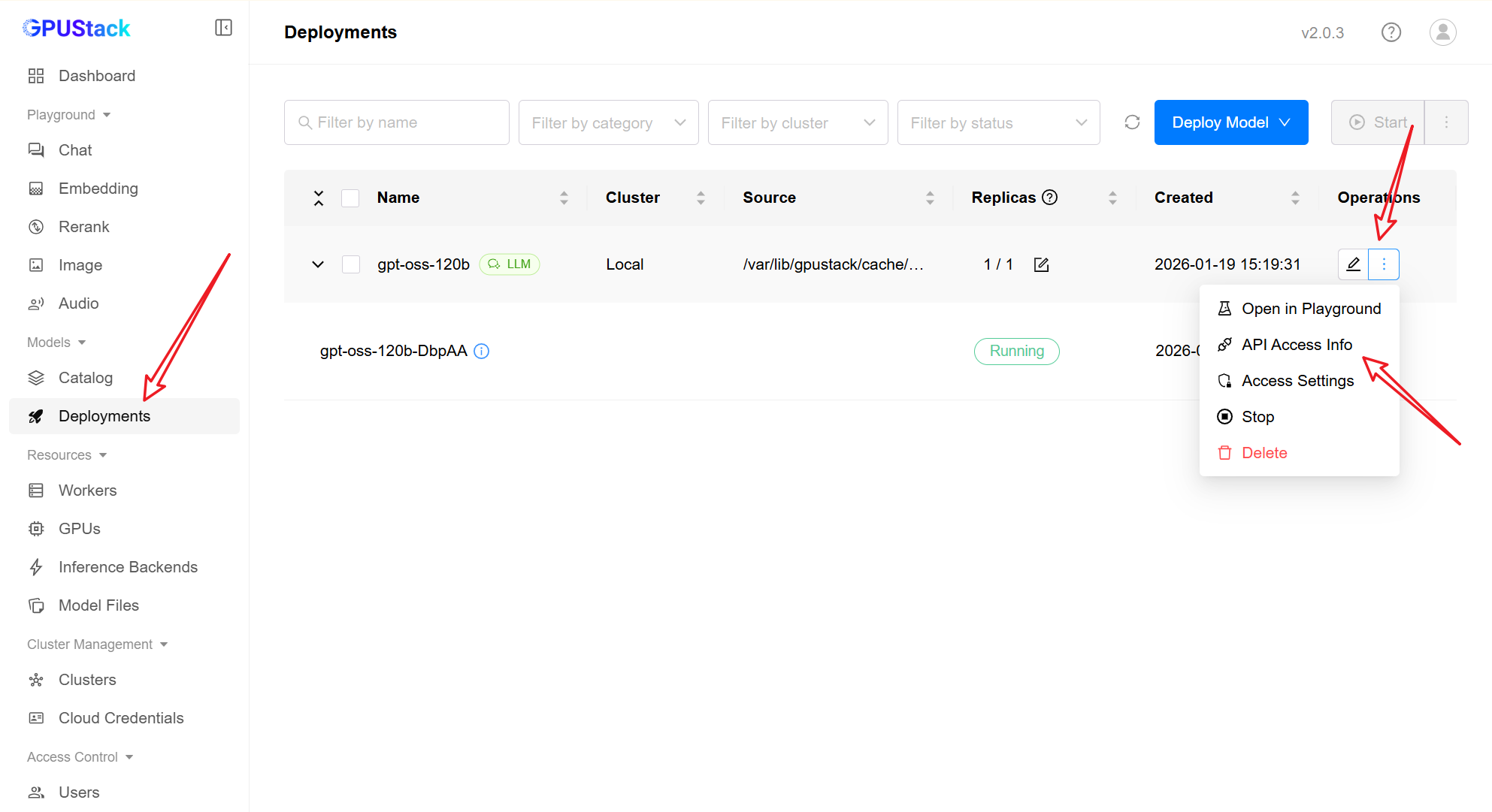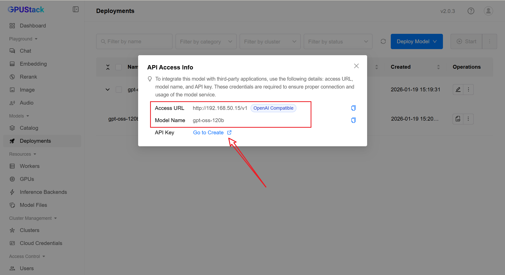 首先,我们需要获取模型的调用地址。在 GPUStack 的 Deployments 列表找到目标模型,通过右侧菜单点击 API Access Info。系统会弹出详细的接入信息,若尚未配置密钥,可直接点击窗口内的链接跳转至创建页。