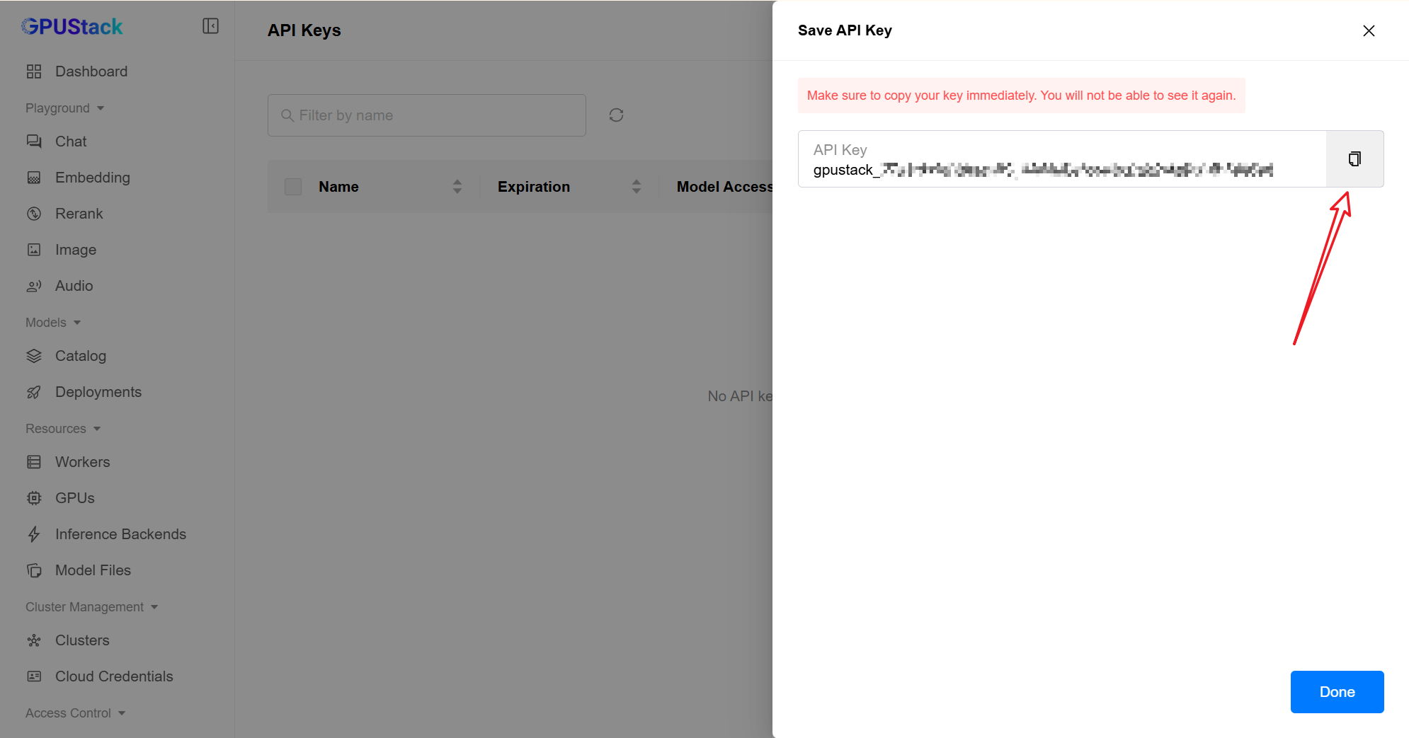 成功创建后,生成的 API Key 将作为 n8n 访问本地模型的安全凭证。由于 Key 仅在创建时显示一次,建议立即将其妥善保存。