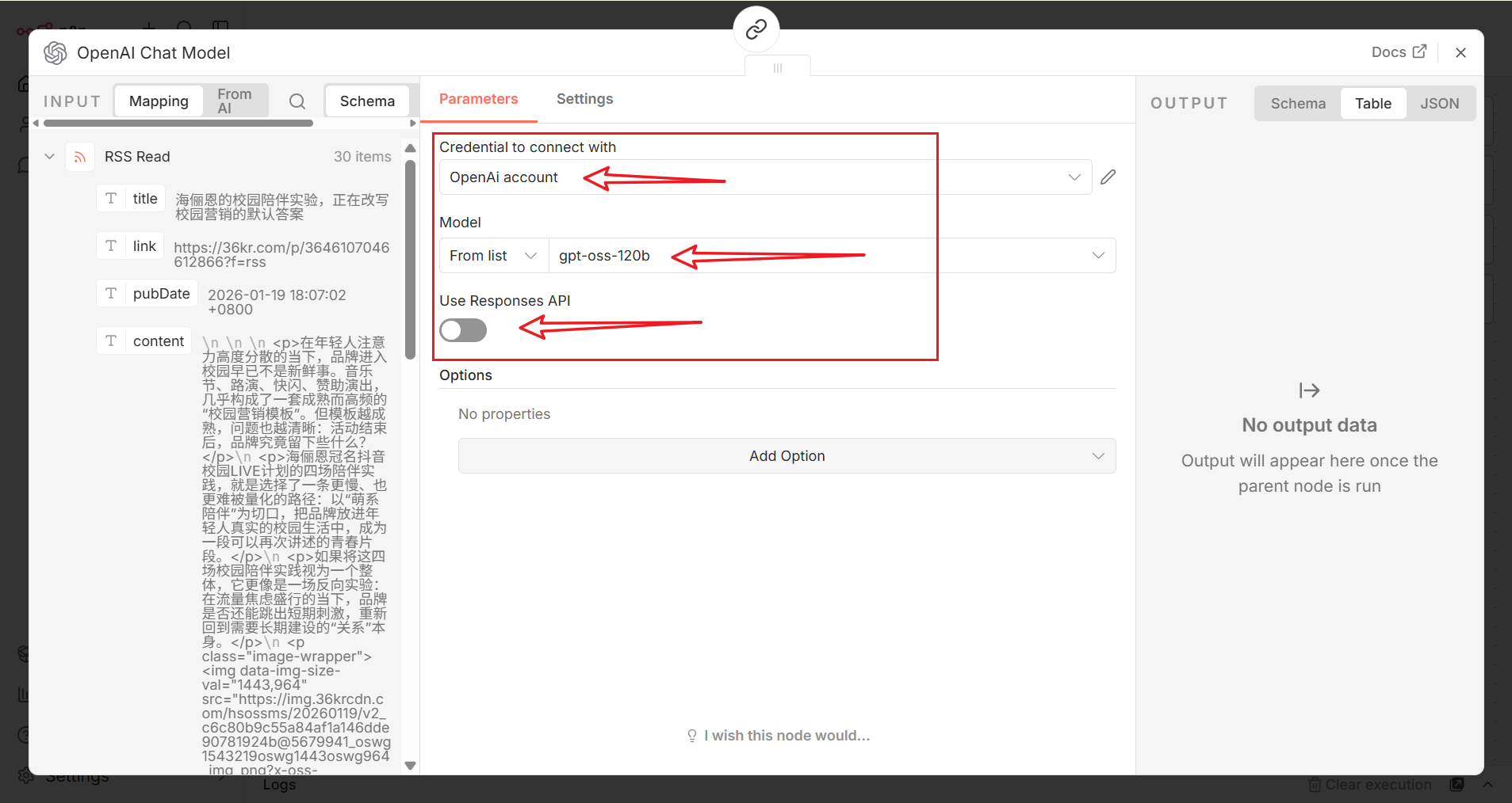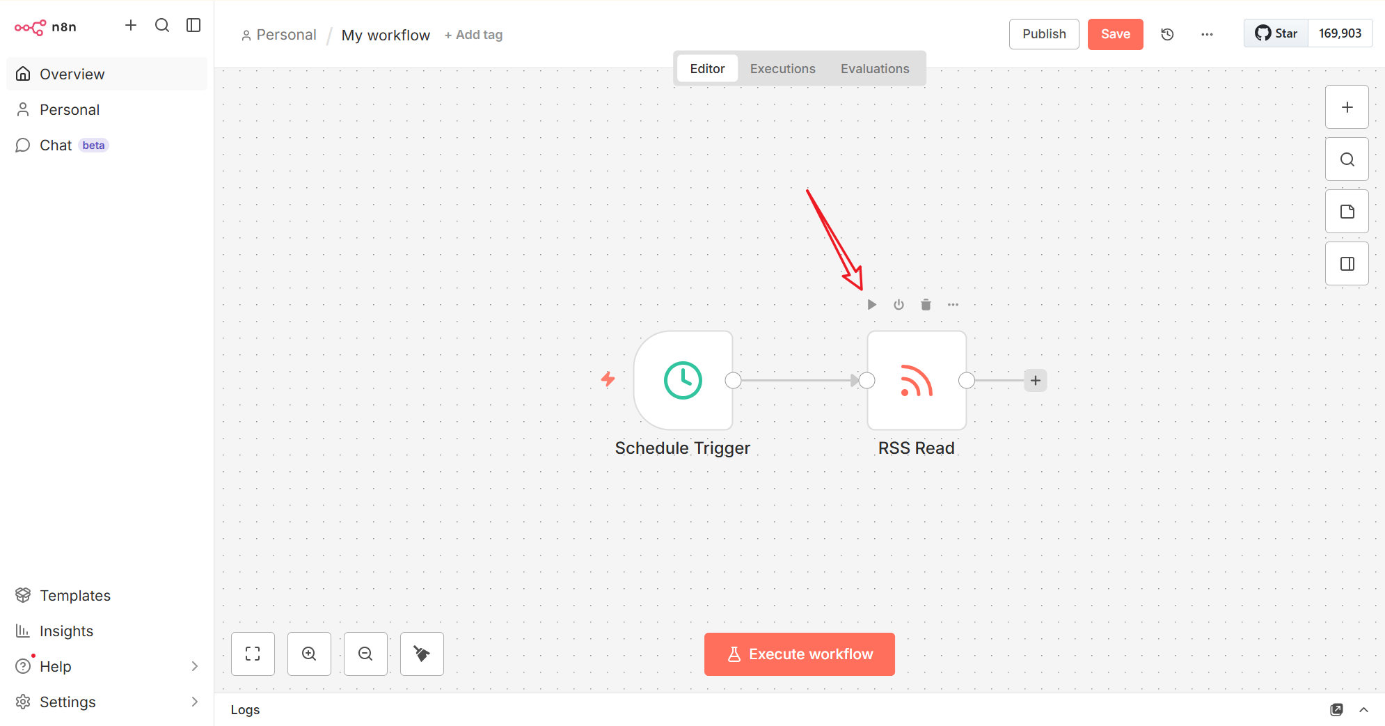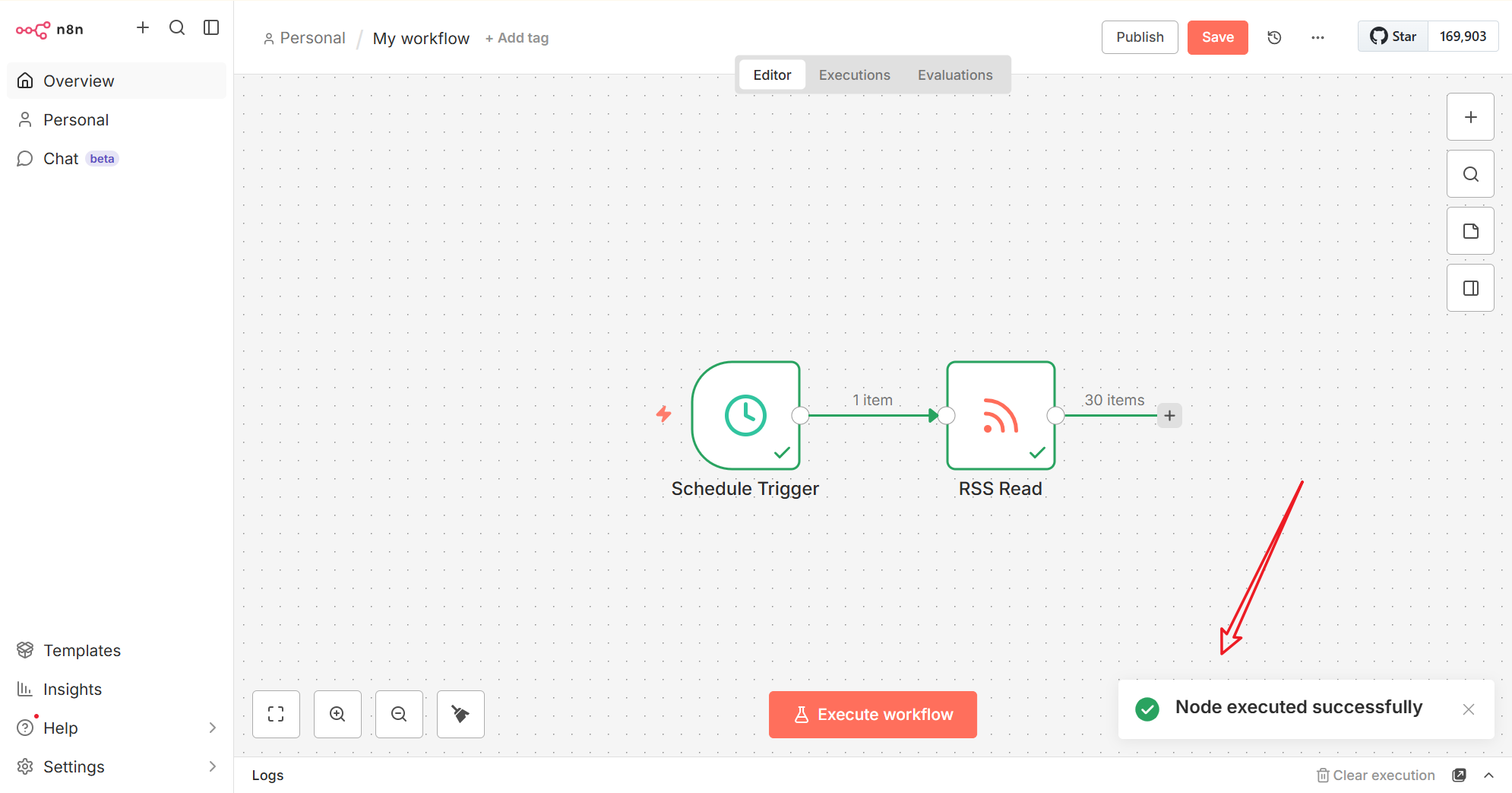 点击测试按钮,验证 RSS Read 节点是否正常工作