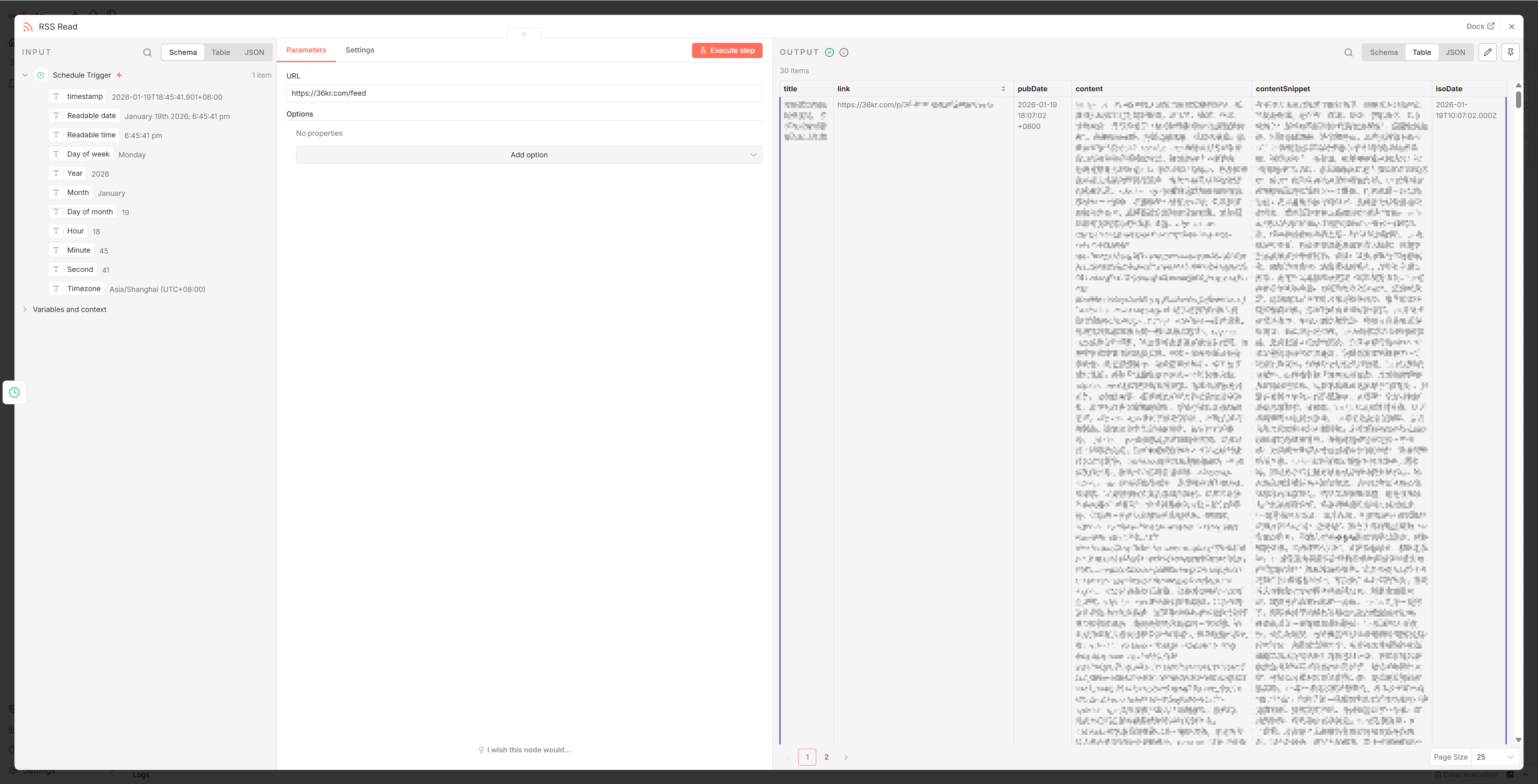 双击 RSS Read 节点可查看执行日志和数据