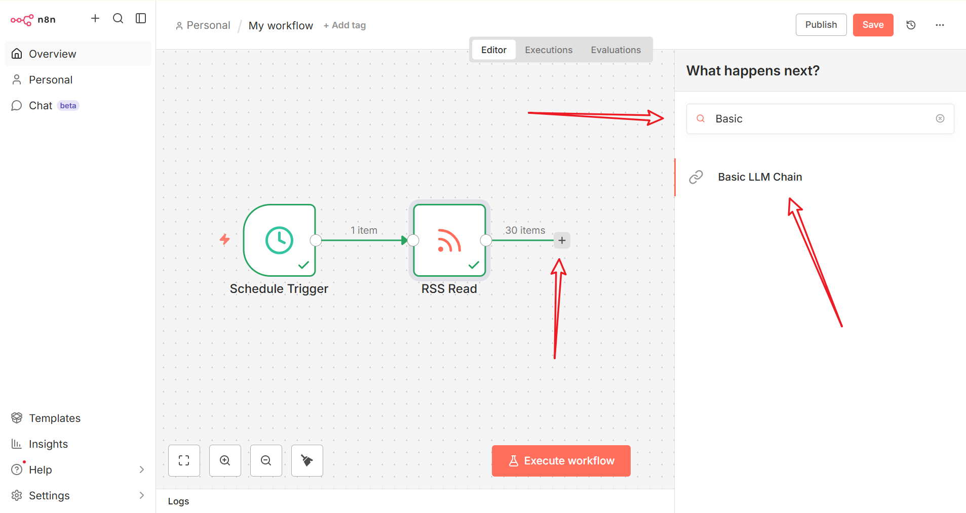 Basic LLM Chain节点,用于提取信息摘要