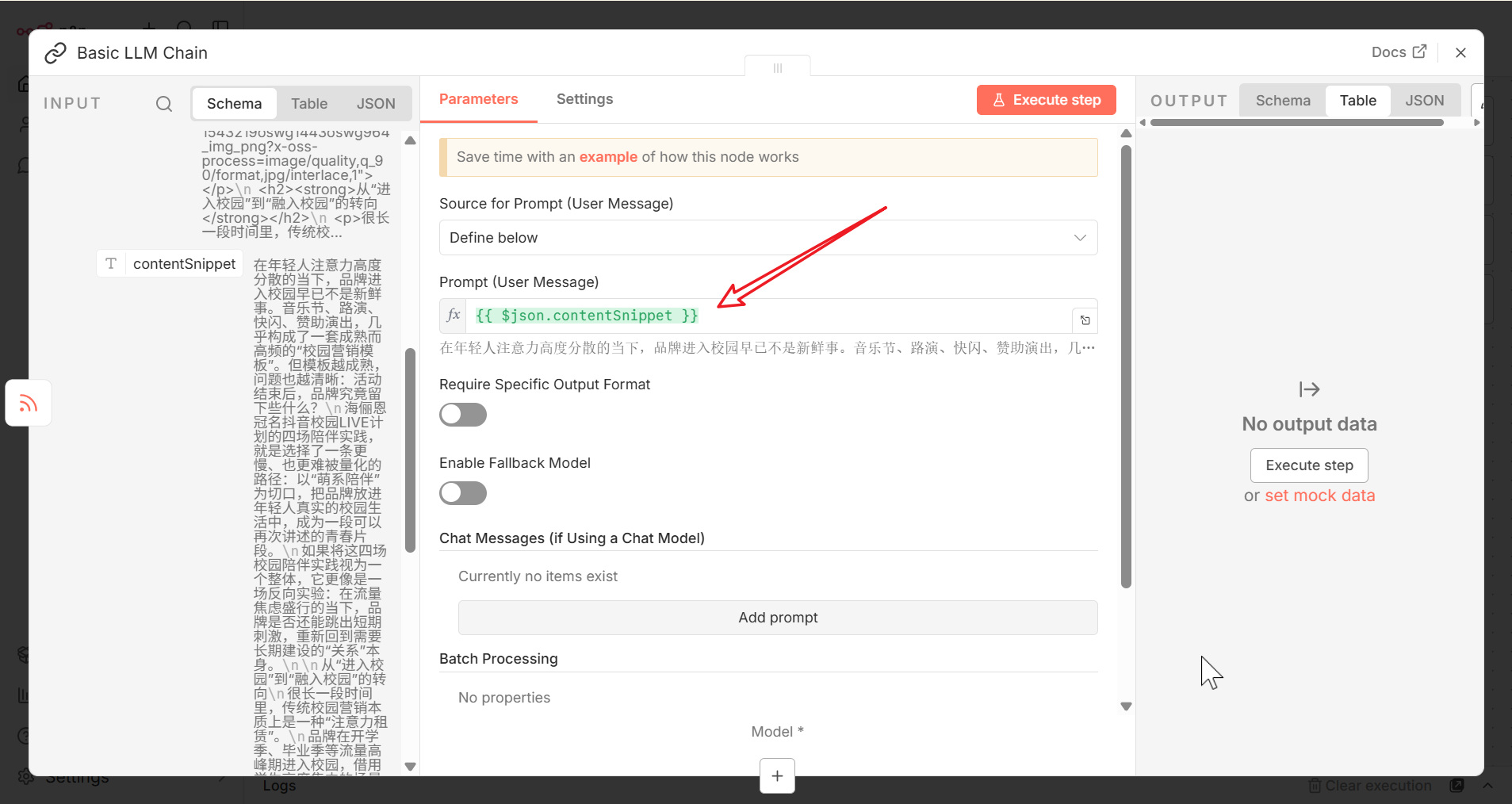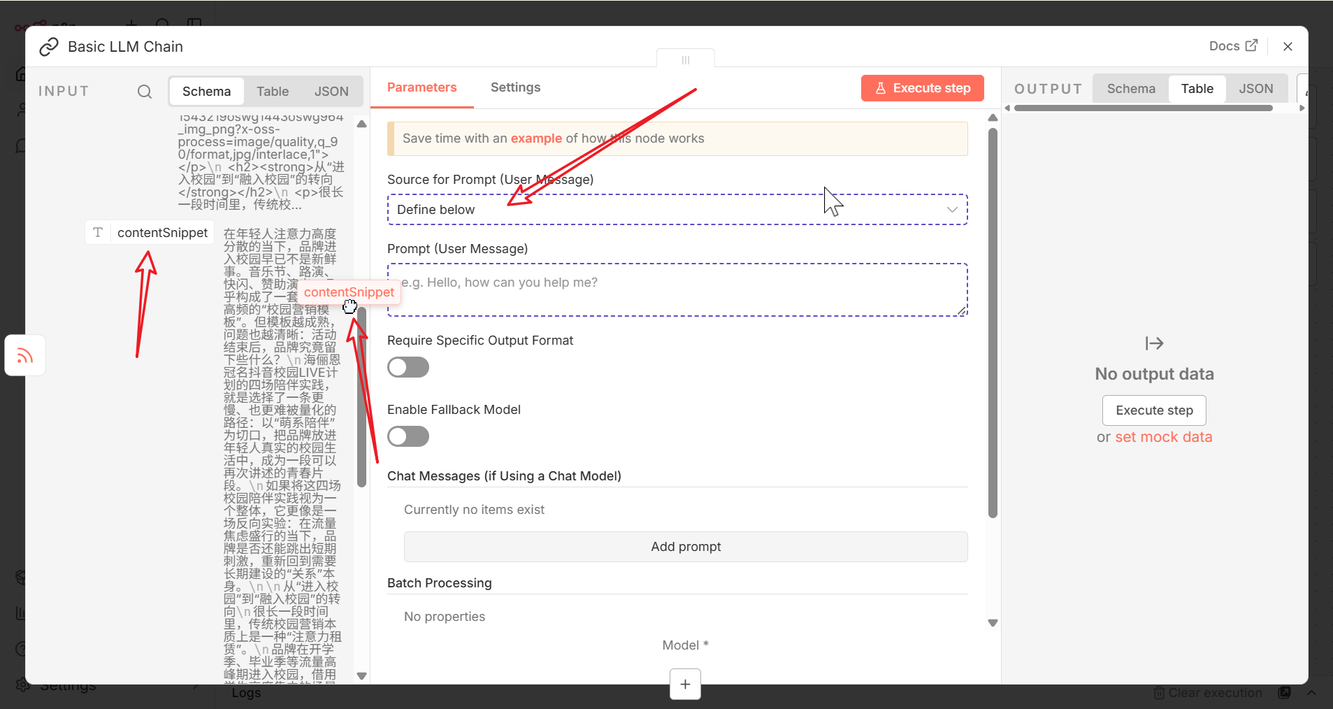 在弹出的配置窗口中,配置 Source for Prompt (User Message) 为 Define below,然后拖动左侧面板 contentSnippet 字段到 Prompt (User Message) 输入框中
