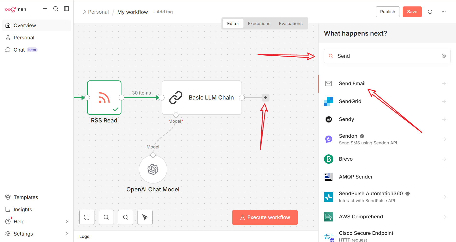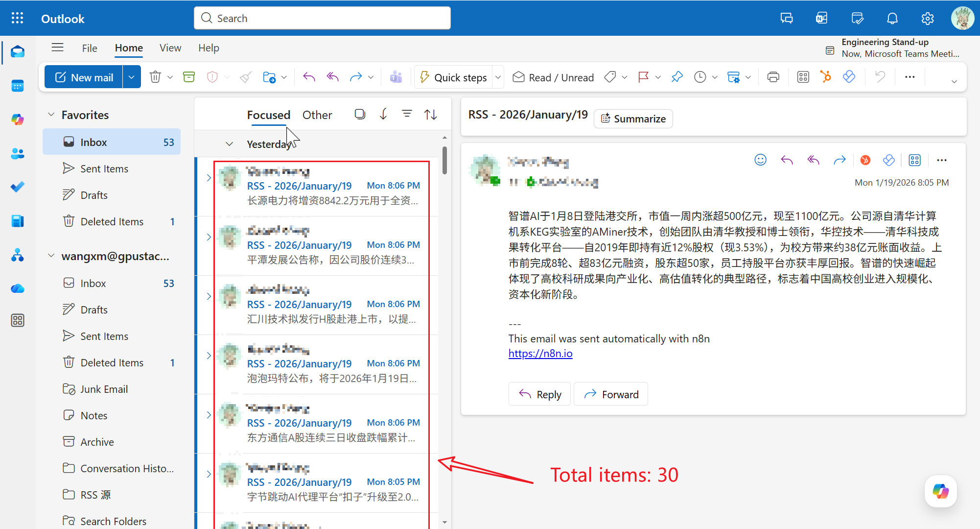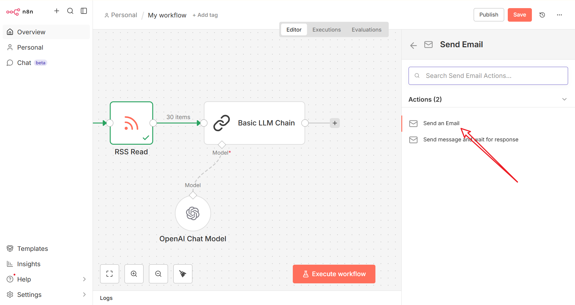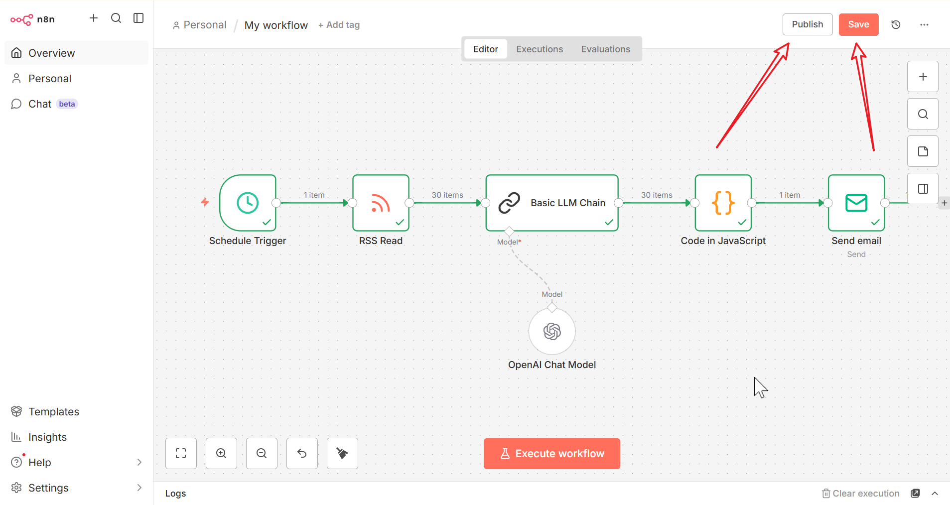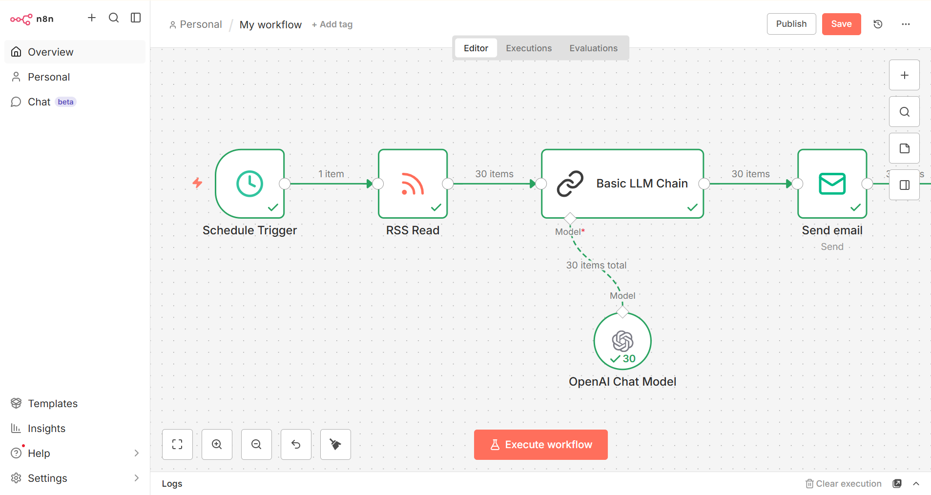 点击 Execute Workflow 手动触发一次工作流。n8n 将抓取最新的 RSS 资讯,调用 GPUStack 进行推理生成摘要,最后通过 Send Email 节点发送邮件。