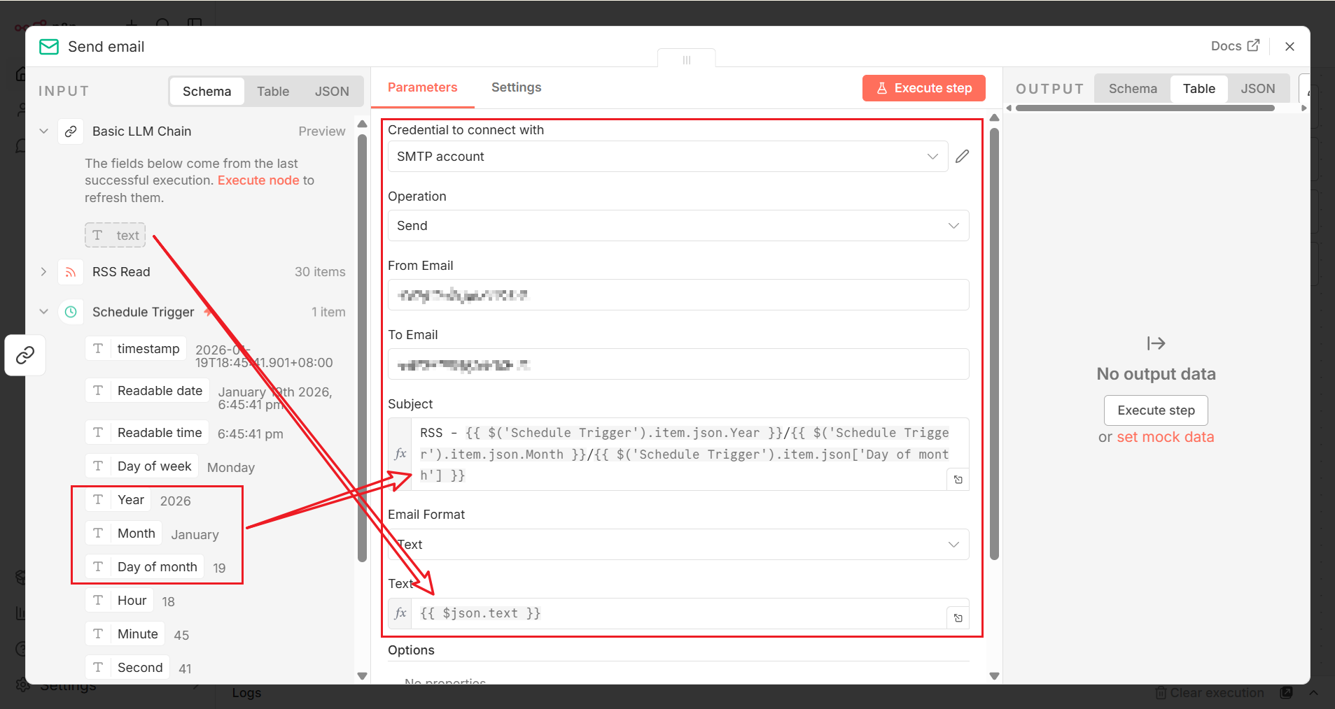 n8n 支持在 {{ }} 中编写 JavaScript 表达式。这里我们使用 {{ $now.format('yyyy-MM-dd') }},以便在邮件主题中自动附带当天的日期信息。