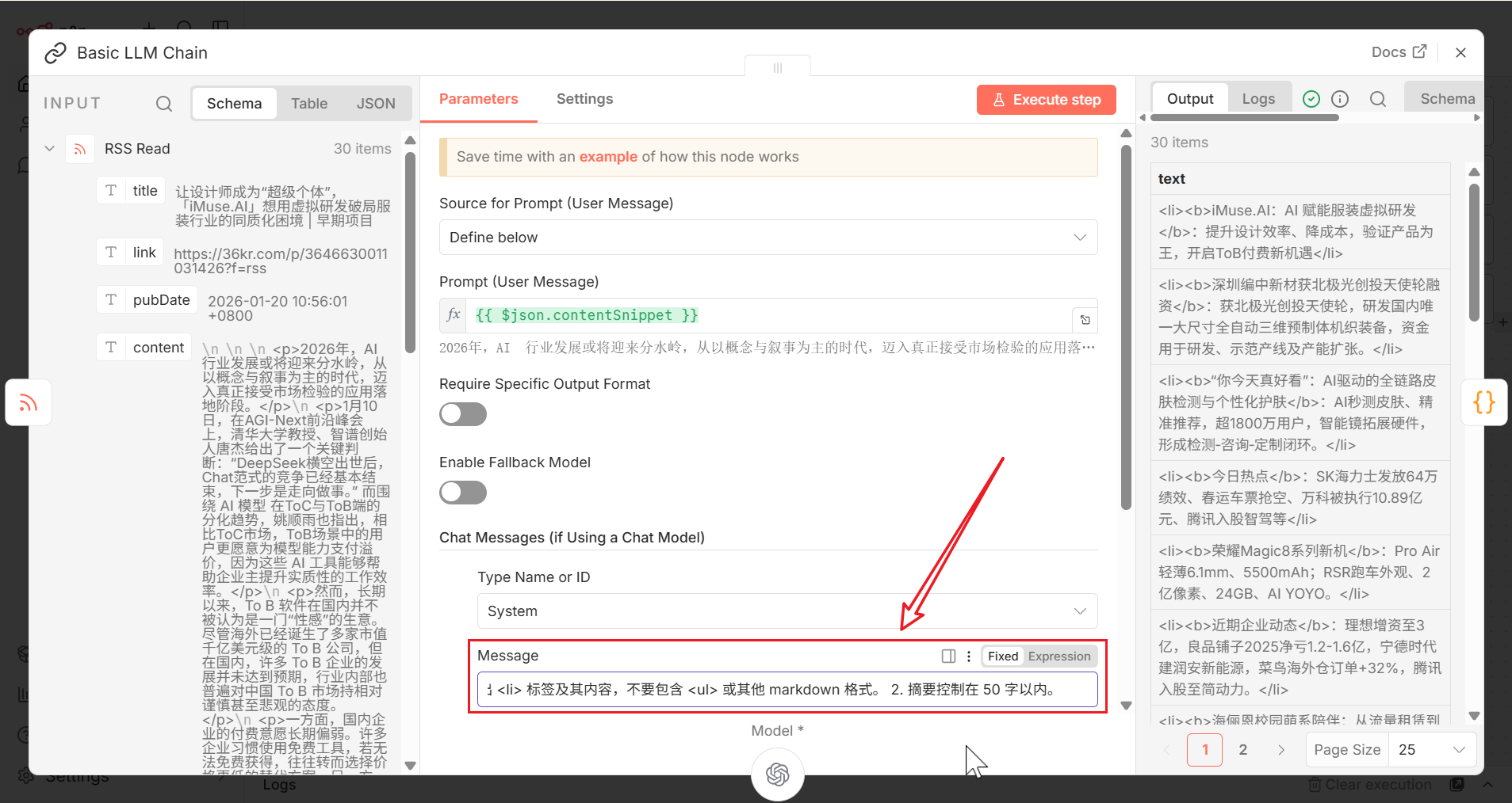 Basic LLM Chain节点上的系统提示词,指导其直接输出一个 list item