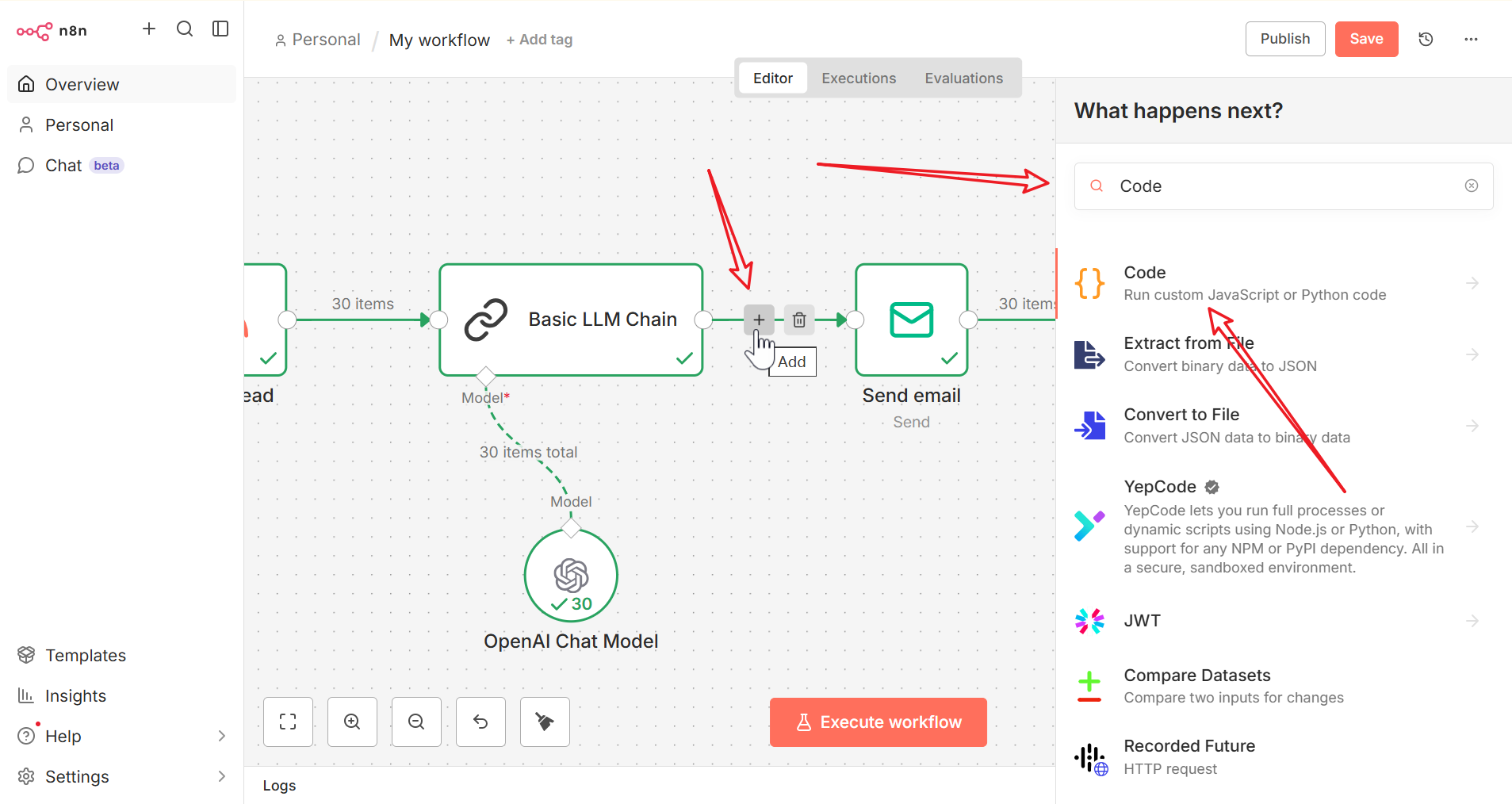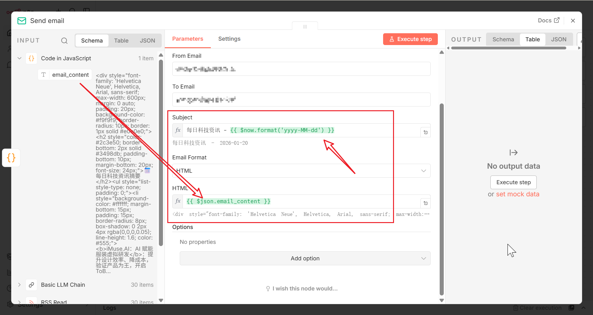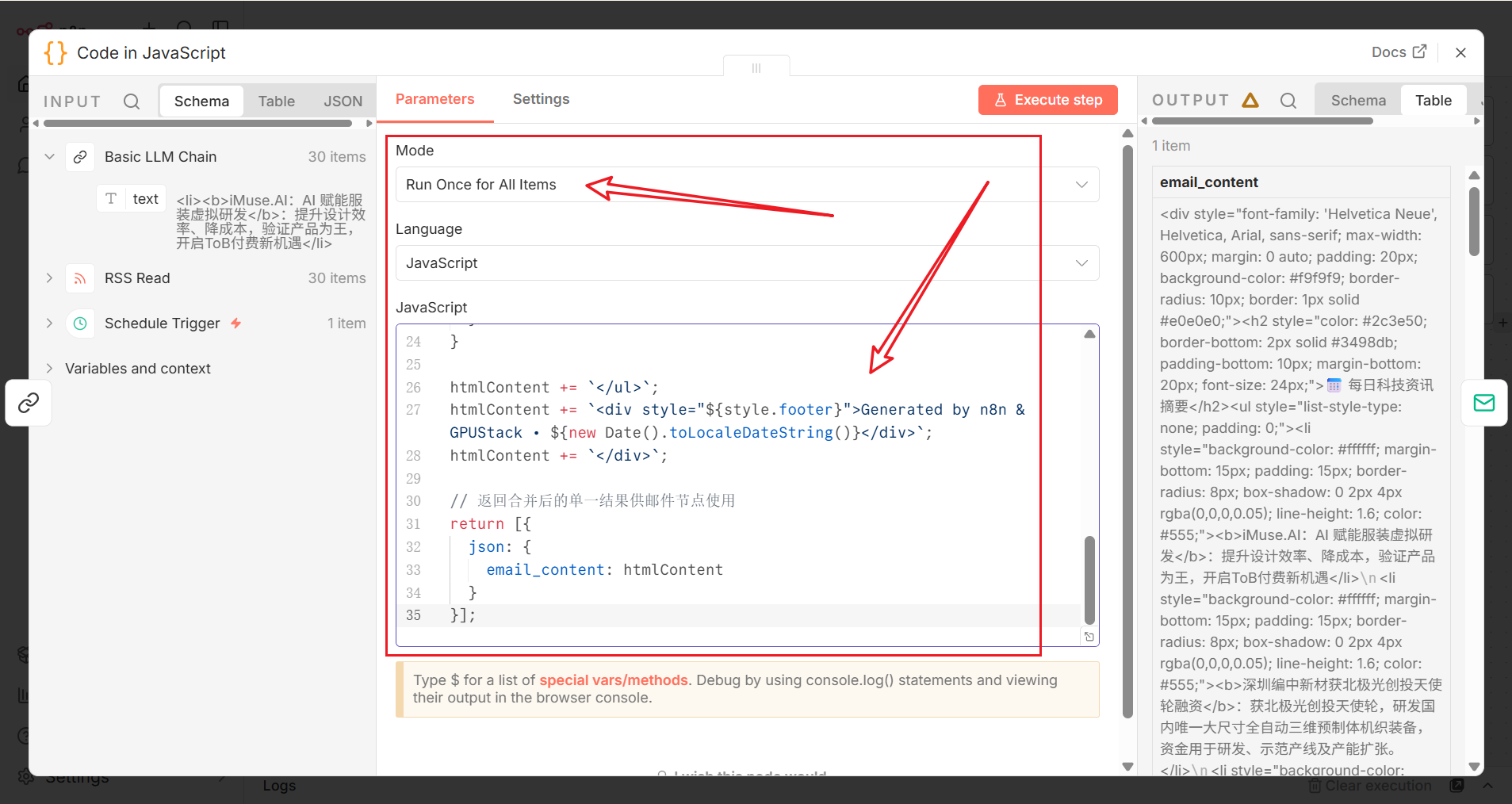 Basic LLM Chain与Send Email节点之间插入一个Code节点,用于将分散的摘要聚合为美观的 HTML 格式。
