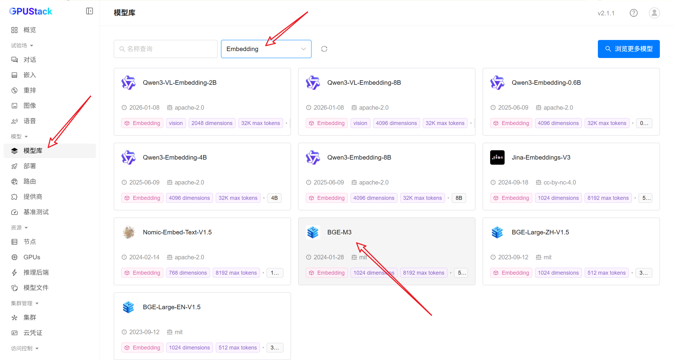 打开模型库,筛选 Embedding 模型