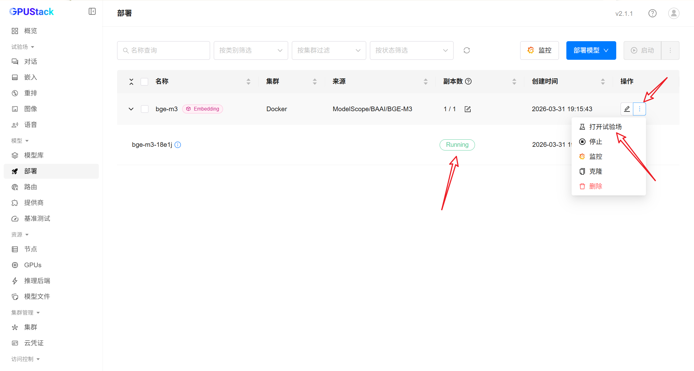 点击部署,等待模型状态变为 Running