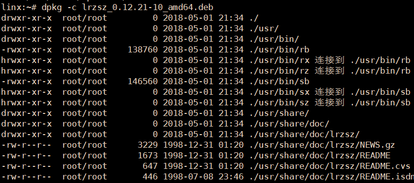 dpkg -c lrzsz.deb 离线包结构