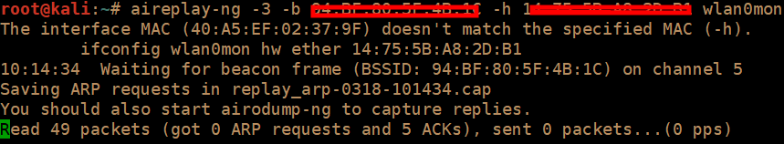 aireplay-ng -3 -b 00:11:22:33:44:55 -h 11:11:22:33:44:55 wlan0mon