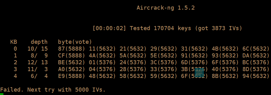 4、在捕获一定量数据包后,开始破解WEP密钥