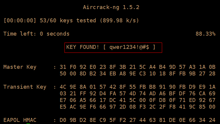 如果捕获握手包,终端左上角会提示WPA hadnshake:接入点mac
