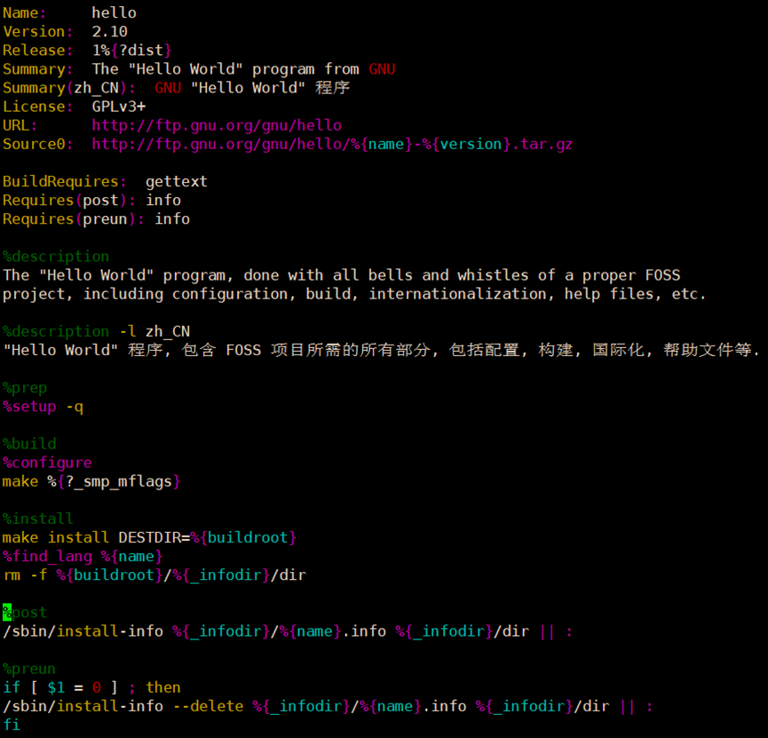 SPEC 文件:这是构建 RPM 包的核心配置文件,它详细描述了如何构建软件包,包括软件包的元数据定义、源代码解压和配置步骤、编译和安装命令、文件列表定义、包的依赖关系等。通过修改 SPEC 文件,可以对软件包的构建过程进行定制。