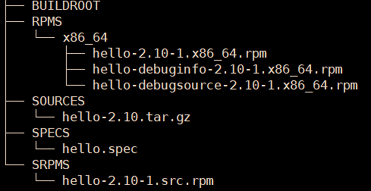 如图,rpmbuild目录部分结构,需要关注的是RPMS/x86_64下的rpm包,和SRPMS下的src.rpm包