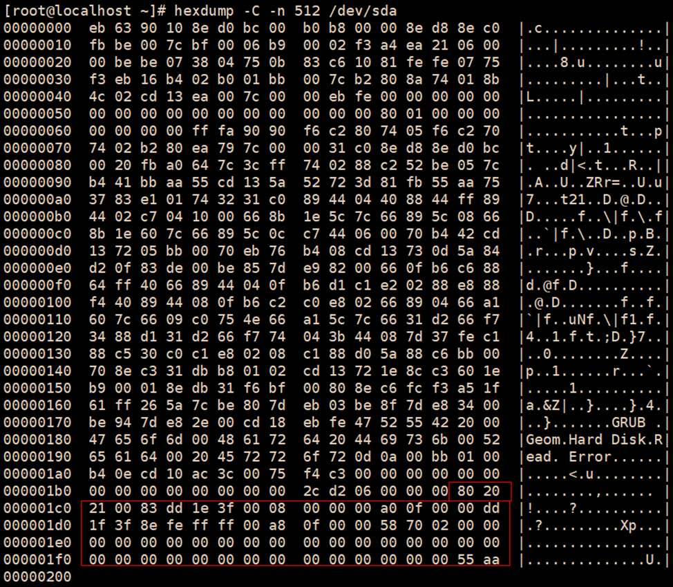 hexdump -C -n 512 /dev/sda