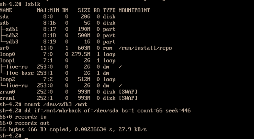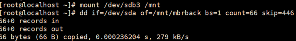 dd if=/mnt/mbrback of=/dev/sda bs=1 count=66 seek=446 #之前只破坏了64字节,而备份了66字节,此处直接使用66字节全覆盖演示