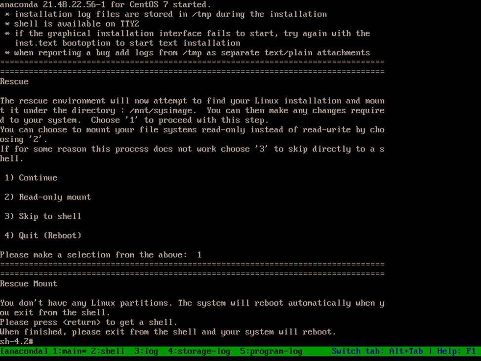 此处分区表已被破坏,无法识别分区,系统也挂载不上,直接选择3,使用镜像shell