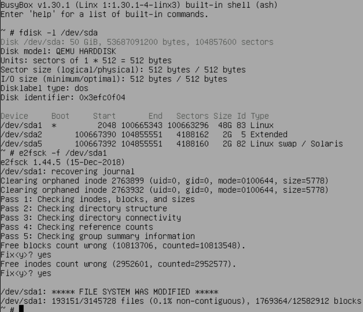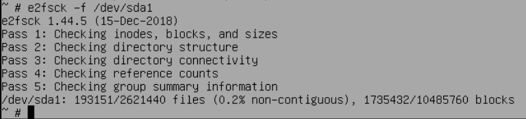 e2fsck -f /dev/sda1 #执行过程中有交互时输入y