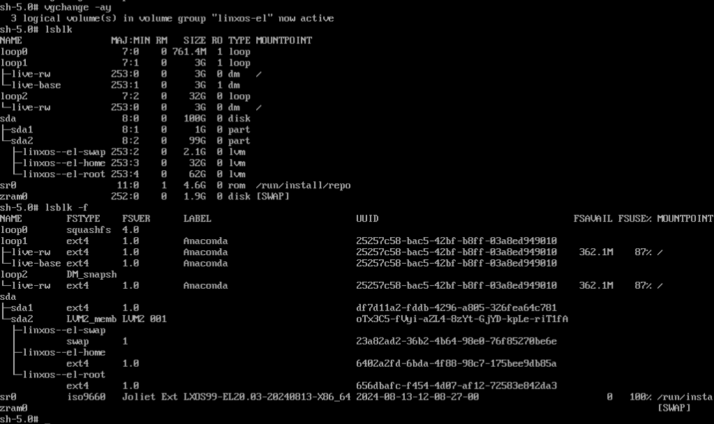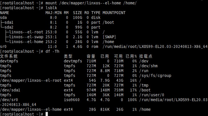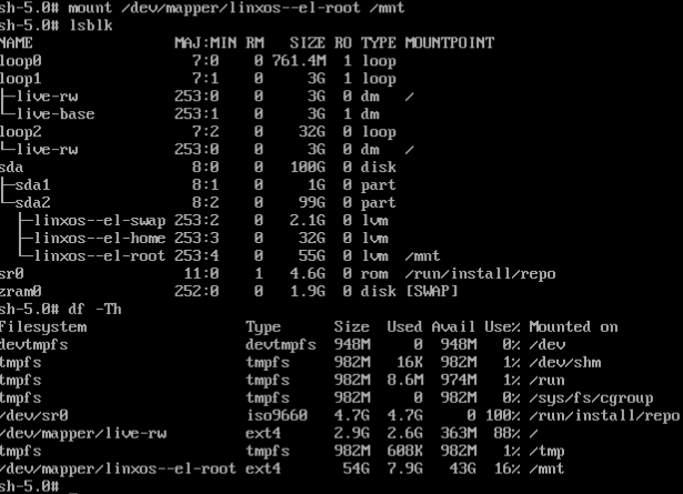 4、挂载根分区,查看分区大小及逻辑卷大小