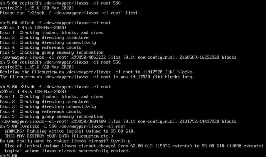 lvresize -L 55G /dev/mapper/linxos--el-root