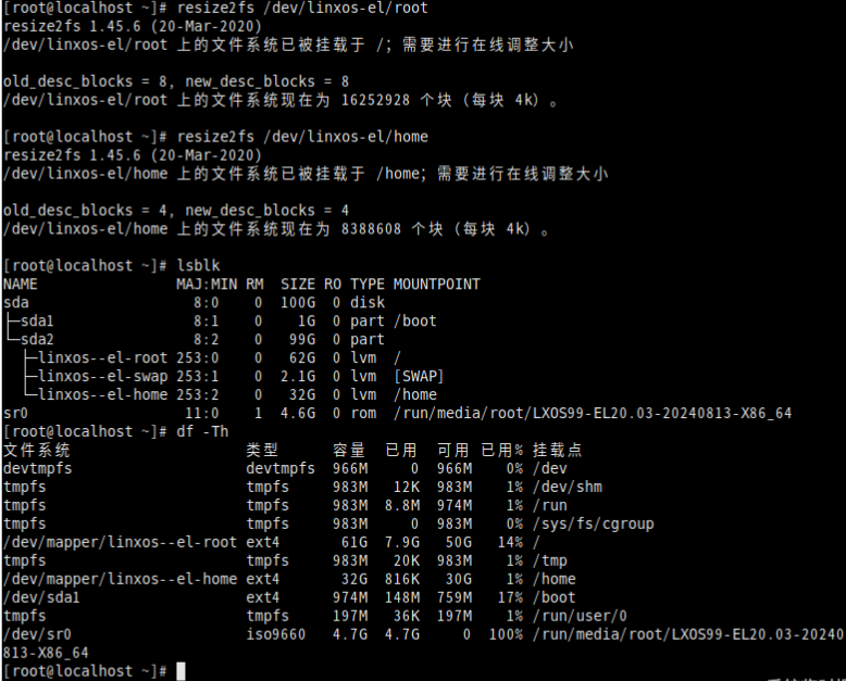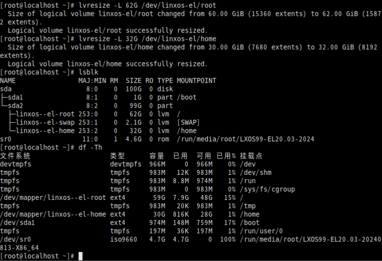 一、演示扩展不可卸载分区/由60G到62G,和可卸载分区/home由30到32G