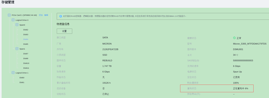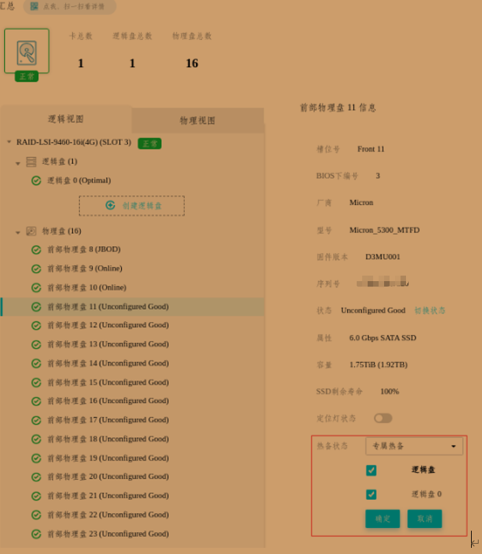 2、备份盘使用,在raid组之外配置的热备盘,在掉盘后迅速接管坏盘