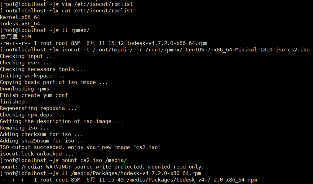 使用isocut裁剪镜像,-r /root/rpmex/ 指定额外的包存放路径,使用绝对路径