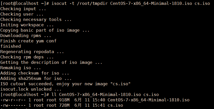 isocut -t /root/tmpdir/ -r /root/rpmex/ CentOS-7-x86_64-Minimal-1810.iso cs2.iso
