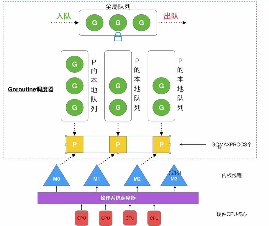 - 「全局队列调度:」 如果 p 的本地队列为空,m 会尝试从全局队列中获取 g。访问全局队列需要加锁,所以相对较慢,但是能保证系统的负载均衡。