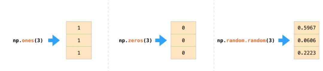 我们可以通过将python列表传入np.array来创建一个NumPy数组(也就是强大的ndarray)。在下面的例子里,创建出的数组如右边所示,通常情况下,我们希望NumPy为我们初始化数组的值,为此NumPy提供了诸如ones,zeros和random.random之类的方法。我们只需传入元素个数即可: