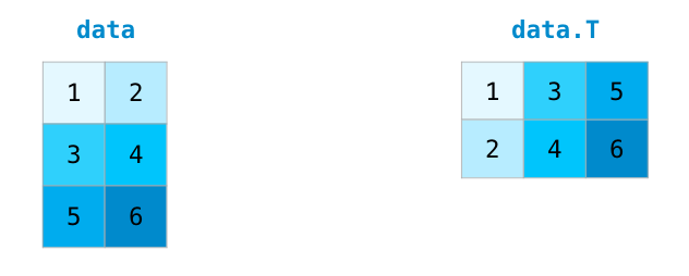 处理矩阵时经常需要对矩阵进行转置操作,常见的情况如计算两个矩阵的点积。NumPy数组的属性T可用于获取矩阵的转置。