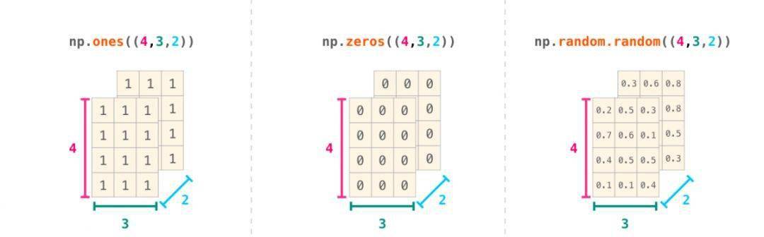 除此外,也可以使用上文提到的ones、zeros和random.random来创建矩阵,只需传入一个元组来描述矩阵的维度: