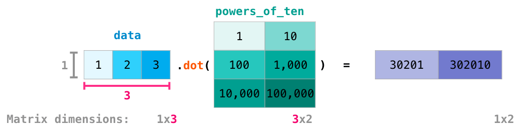 上图的底部添加了矩阵尺寸,以强调运算的两个矩阵在列和行必须相等。可以将此操作图解为如下所示:
