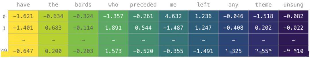 模型需要先训练大量文本才能用数字表示这位战场诗人的诗句。我们可以让模型处理一个小数据集,并使用这个数据集来构建一个词汇表(71,290个单词):