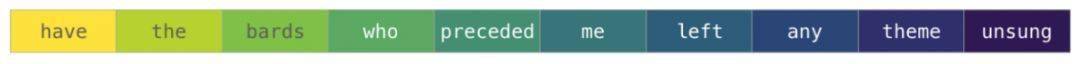 如果我们处理文本,情况就会有所不同。用数字表示文本需要两个步骤,构建词汇表(模型知道的所有唯一单词的清单)和嵌入(embedding)。让我们看看用数字表示这个(翻译的)古语引用的步骤:“Have the bards who preceded me left any theme unsung?”