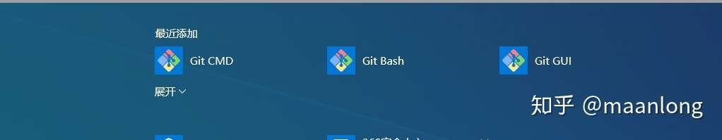 到此,Git的安装完成,可以在开始菜单中看到Git的三个启动图标(Git Bash、Git CMD(Deprecated)、Git GUI)。