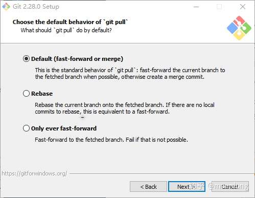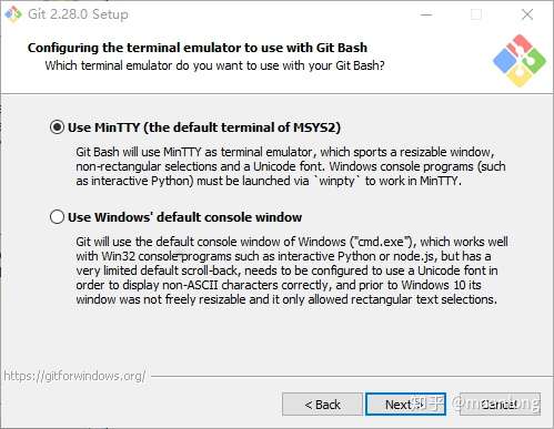 第二个选项是“使用Windows的默认控制台窗口”。Git将使用Windows的默认控制台窗口(“cmd.exe”),该窗口可以与Win32控制台程序(如交互式Python或node.js)一起使用,但默认的回滚非常有限,需要配置为使用unicode 字体以正确显示非ASCII字符,并且在Windows 10之前,其窗口不能自由调整大小,并且只允许矩形文本选择。