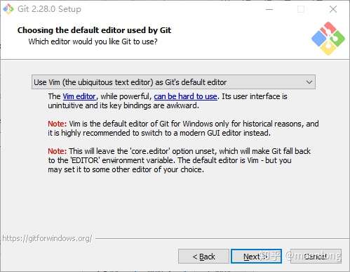 这个页面是在选择Git文件默认的编辑器,很少用到,所以默认Vim即可,直接点“Next”按钮继续到下图的界面: