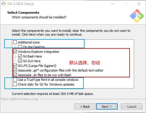 上图红框内的选项是默认勾选的,建议不要动。绿色框1是决定是否在桌面创建快捷方式的。绿色框2是决定在所有控制台窗口中使用TrueType字体和是否每天检查Git是否有Windows更新的。这些根据自己需要选择。