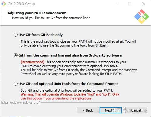 第三种配置是“从命令提示符使用Git和可选的Unix工具”。警告:这将覆盖Windows工具,如 “ find 和 sort ”。只有在了解其含义后才使用此选项。