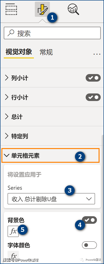 然后点开这个矩阵的格式面板,找到“单元格元素”(之前的版本是条件格式),选择某个度量值,然后打开背景色并点击fx按钮:
