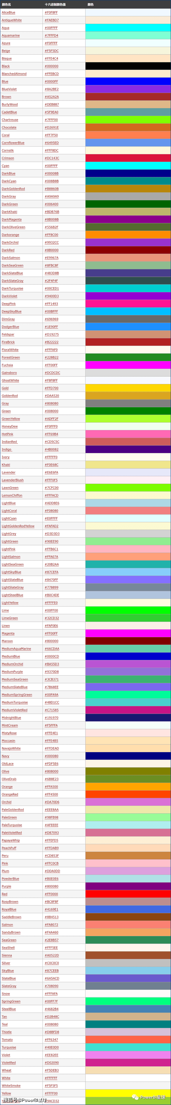 以下是受支持的140种颜色名称以及对应的颜色,你可以收藏起来,需要DAX配色时可直接查找使用: